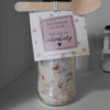 Een fles gevuld met een mix van o.a Himalayazout, Epsomzout, Dode Zeezout, verse calendula en een ontspannen geur van de etherische olie Eucalyptus